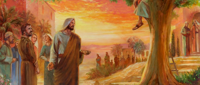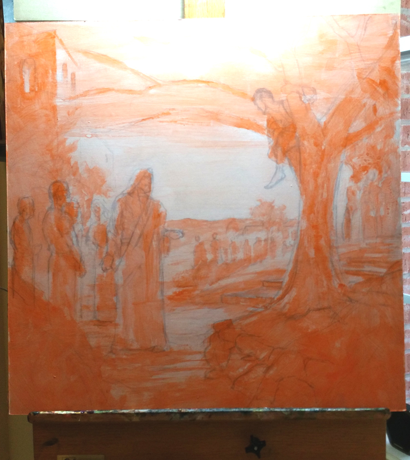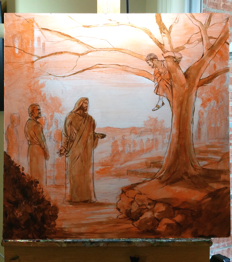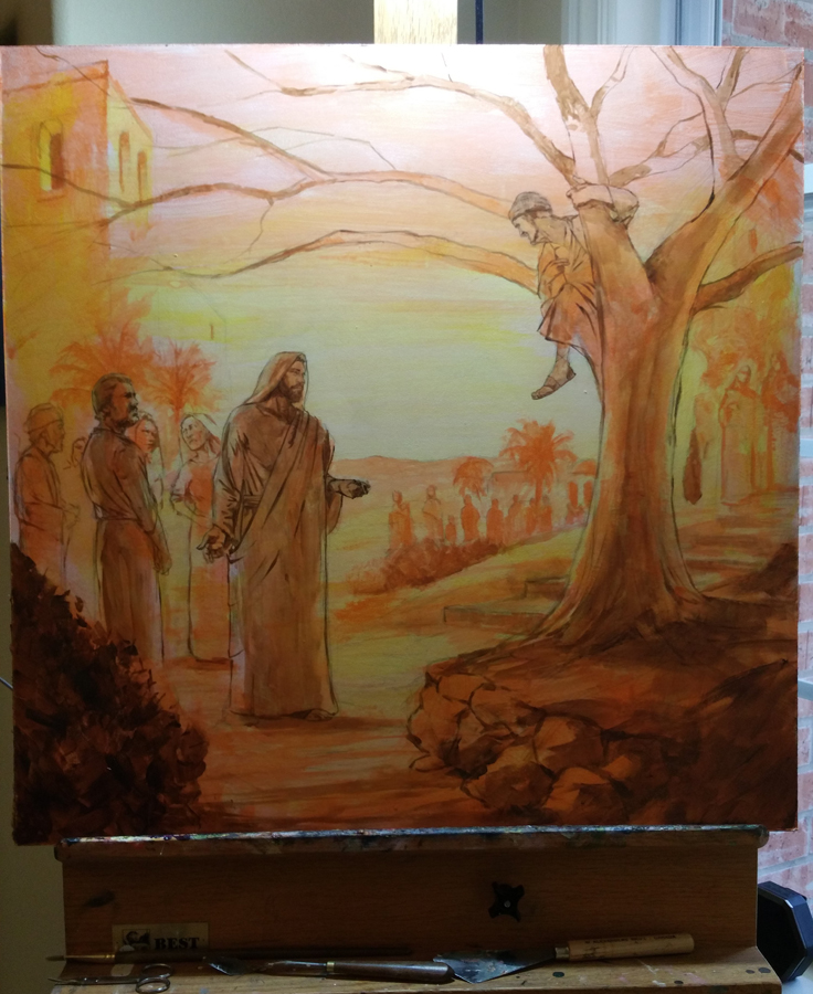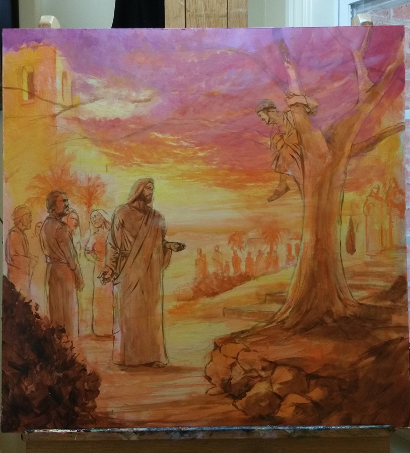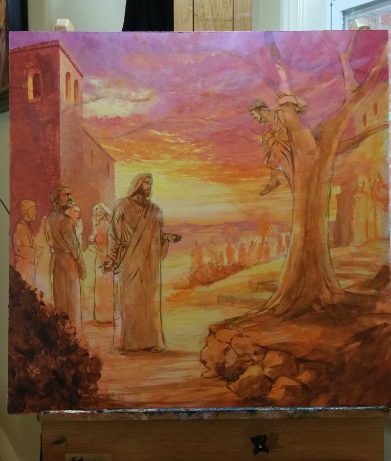 int Jesus meeting Zacchaeus. I look at all the available art that has been done over the years to portray this event. Some show the perspective of high in the tree over Zacchaeus’ shoulder, which confuses me a bit, as it places the viewer higher in the tree than Zacchaeus. As I wonder how I can paint this picture that hasn’t been seen a dozen times I notice a lot of the pictures look like middle of the day scenery, with blue skies. I get an idea. If I can’t do something completely different with a scene that is familiar throughout all of Sunday School-dom, I’ll just make it a “perdy picture”. I thought it might be nice to make the sky brilliant sunset, since it might be getting close to the evening meal.