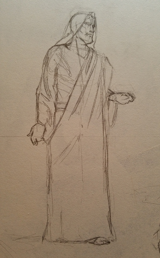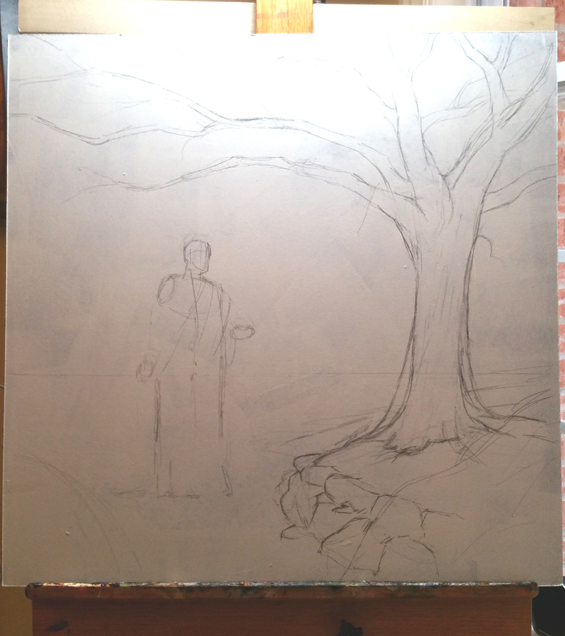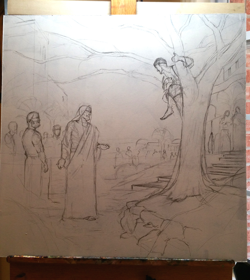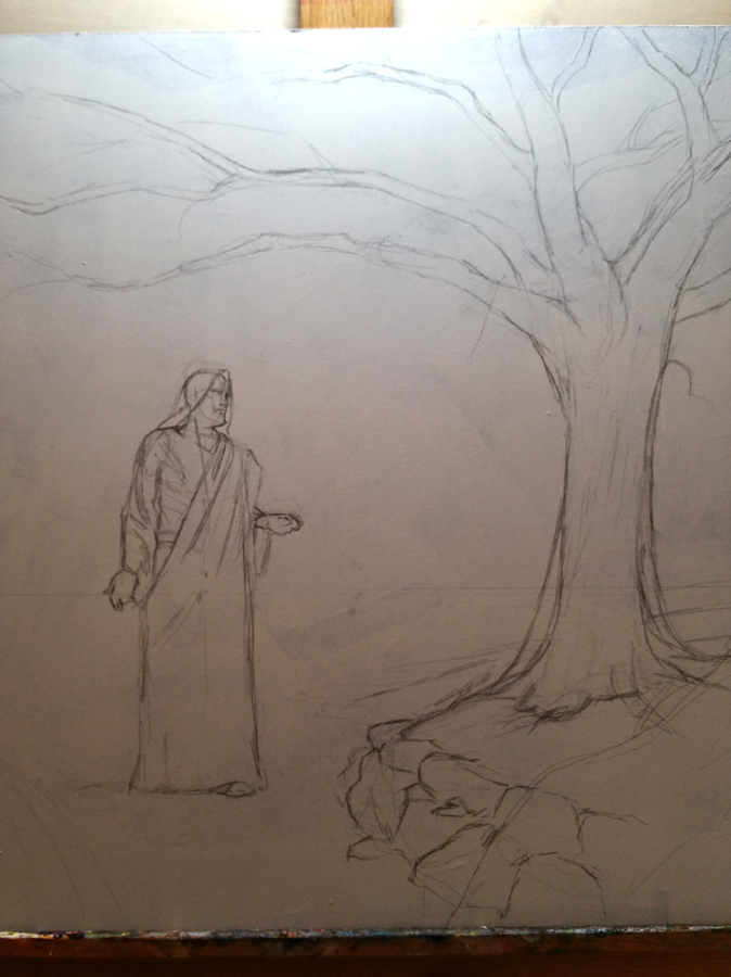 After I have the focal point of the painting, which is Jesus, I draw in the structure of the tree, without leaves (I paint those later). Here I start to achieve some depth to the drawing by showing some stones around a raised bed that might wind through the city. I make sure to leave plenty of open area around the figure of Jesus, this will allow Him to easily be the focal point from a distance.
