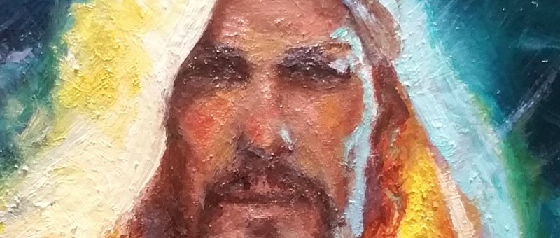 After the tree is established, but not finished, I move on to the figure of Jesus, or the focal point of the picture. I like to get the focal point done as early as I can, because everything will relate to that part. I have to be careful to choose contrasting colors, but not too “cool” for the clothing, and not too dark, but enough so it stands out from the light background. Nice neutrals against the high croma works both with contrast and makes the background appear brighter.