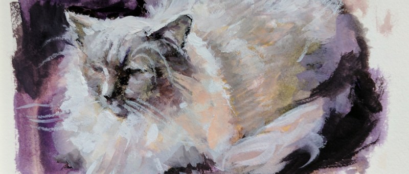 Mr. Molesly is a great big cat, and like most cats, he likes to nap. I have just enough time to capture a quick paint sketch in gouache paint (I used white, black, yellow, orange, and purple). He moved his head a few times, and when he would move,I would concentrate on painting other areas such as the tail or background until his pose was returned to the one I was trying to portray. All in all, I think painting from life captures the essence or spirit of the subject in a way that painting from a photograph never could.
