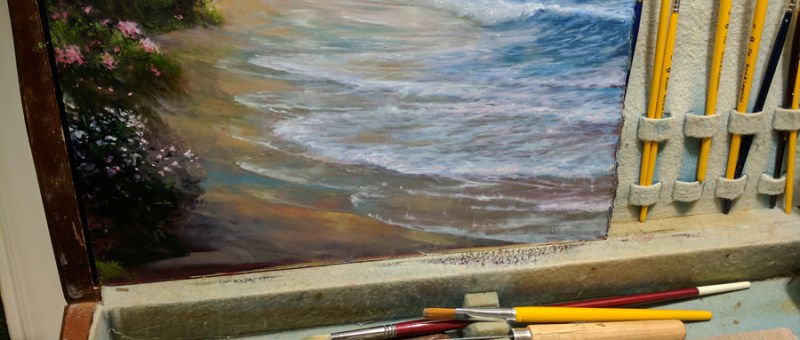 I have really enjoyed using an old silverware box I picked up at a garage sale as my portable easel. It even has handy brush holders built right in!